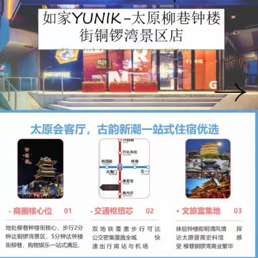首旅如家为您推荐 YUNIK-太原柳巷钟楼街铜锣湾广场店 以及 酒店预订、优惠促销、会员商城,YUNIK-太原柳巷钟楼街铜锣湾广场店 信息,酒店地址: 山西太原迎泽区海子边西街三圣庵15号。